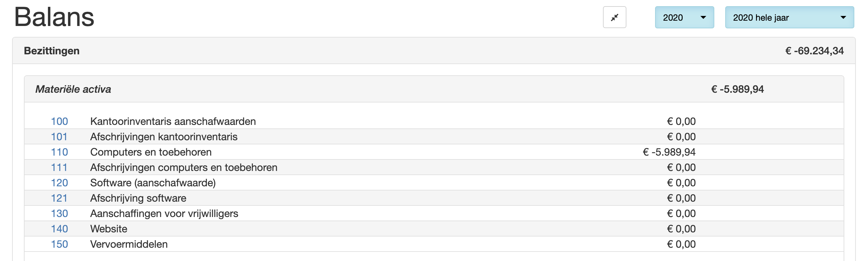 (Vaste) Activa wordt geregistreerd op grootboekrekeningen op de balans (categorie bezittingen). Die kun je naar eigen wens toevoegen via het menu rekeningschema voor zover die niet aanwezig zijn. De verfijning is een eigen overweging. Onderstaand is een overzicht zoals een huurdersvereniging dat heeft ingericht.
