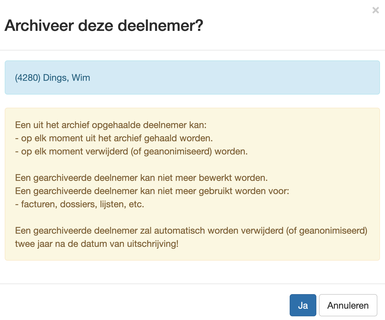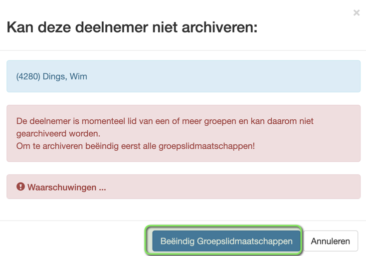 Maar… er komt deze week een nieuwe feature aan en deze doet een keer per maand alle deelnemers archiveren waarvan de afmeldingsdatum is bereikt. Je krijgt dan in een notitie aangereikt over wie het allemaal gaat.
